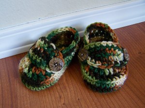 I’ve been wanting to make the twins some crocheted baby things, but since I don’t know what flavor they are yet, I have to either make neutral things or use the yarn I have on hand and experiment. Well, these little man slippers are more an experiment than anything else. I had this variegated yarn left over from a different project and thought I’d try making a polkadot posh pattern. The problem now is that I can’t find my array of crochet hooks in various sizes and I don’t have the right yarn for the pattern. So, I just made do with what I had and they ended up being the right size for Liam. 🙂 Happy dance! They fit him so cute and he loves to wear them. He has a pair of doggy slippers that he loves to wear, but they are way too small. So, hopefully these will somewhat replace those.