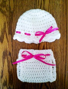 I plan to have the twins dressed in crocheted items for their announcement photo. I believe this is what I would like if one of them is a girl. However, I will probably change the ribbon color to coordinate with the other one, whether boy or girl. If neither one is a girl, this cute set may be going to someone as a gift or getting sold.