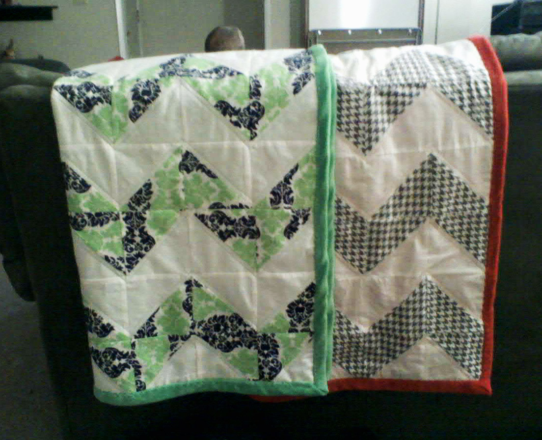 I made Liam a baby blankie before he was born and wanted to make one for each of the twins as well. I have been loving chevrons lately, so I decided to make theirs zig zag quilts. They came together really easily (just a bit time-consuming) and look cute. I love the color combinations of both of them.