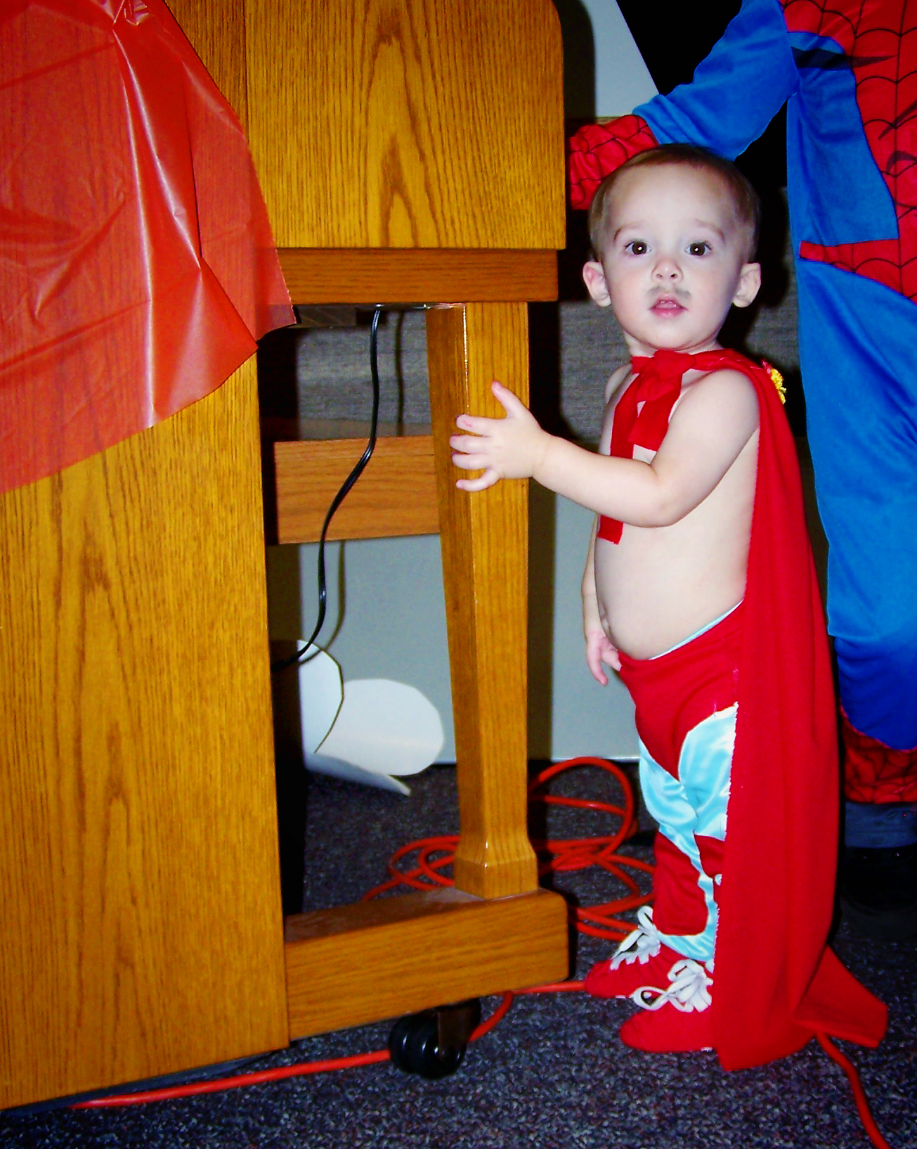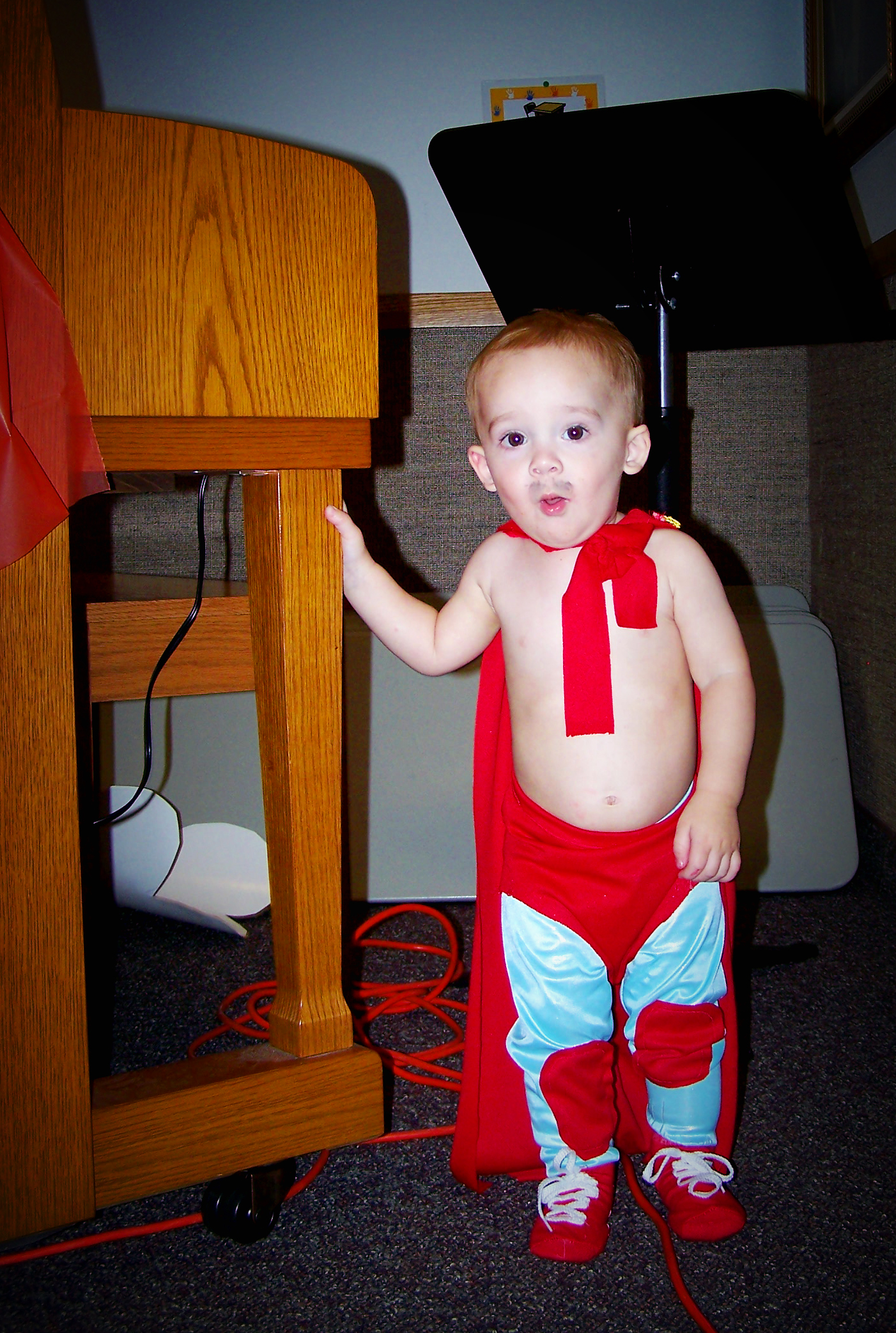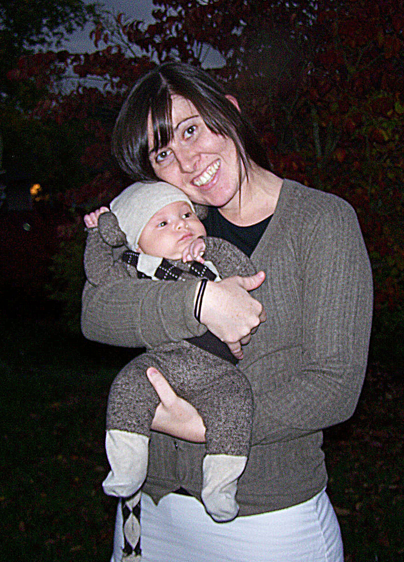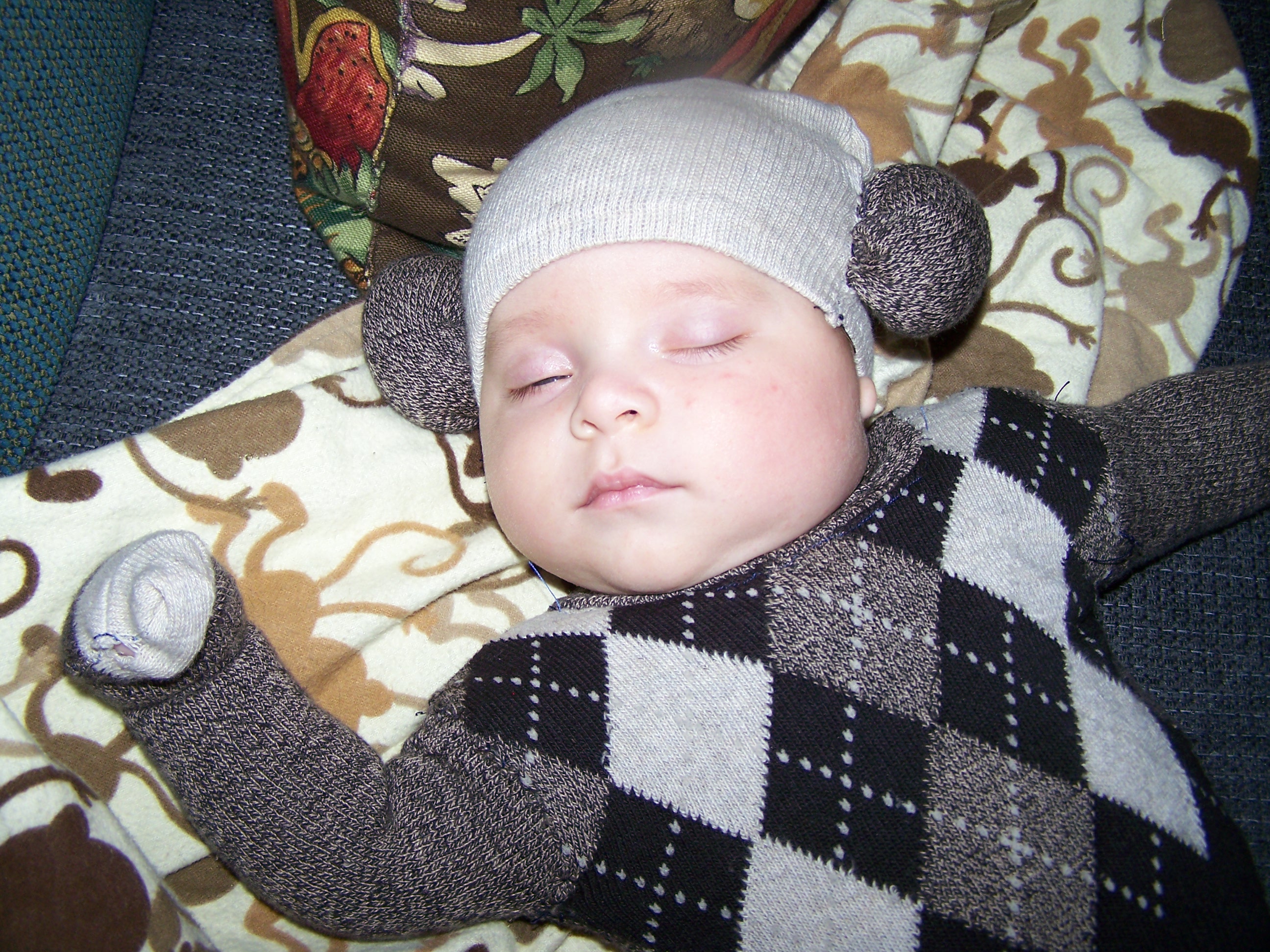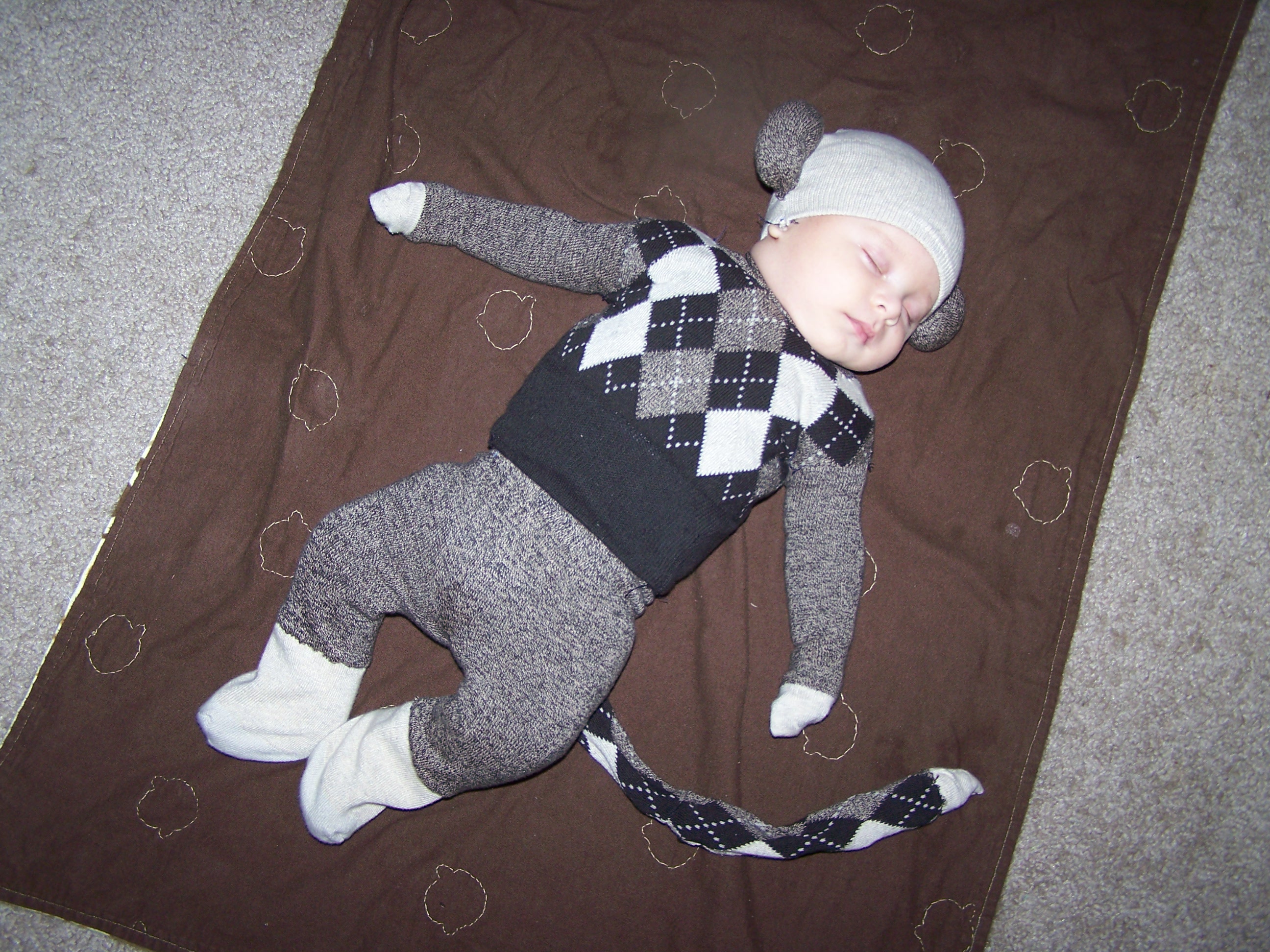 And, the year before that Liam was just a couple months old and was a sock monkey. I loved this costume. I used real socks (I couldn’t find the actual socks with the red heel that sock monkeys are normally made from) and stitched up the little pants, shirt, and hat. Oh yeah, he had a tail, too.