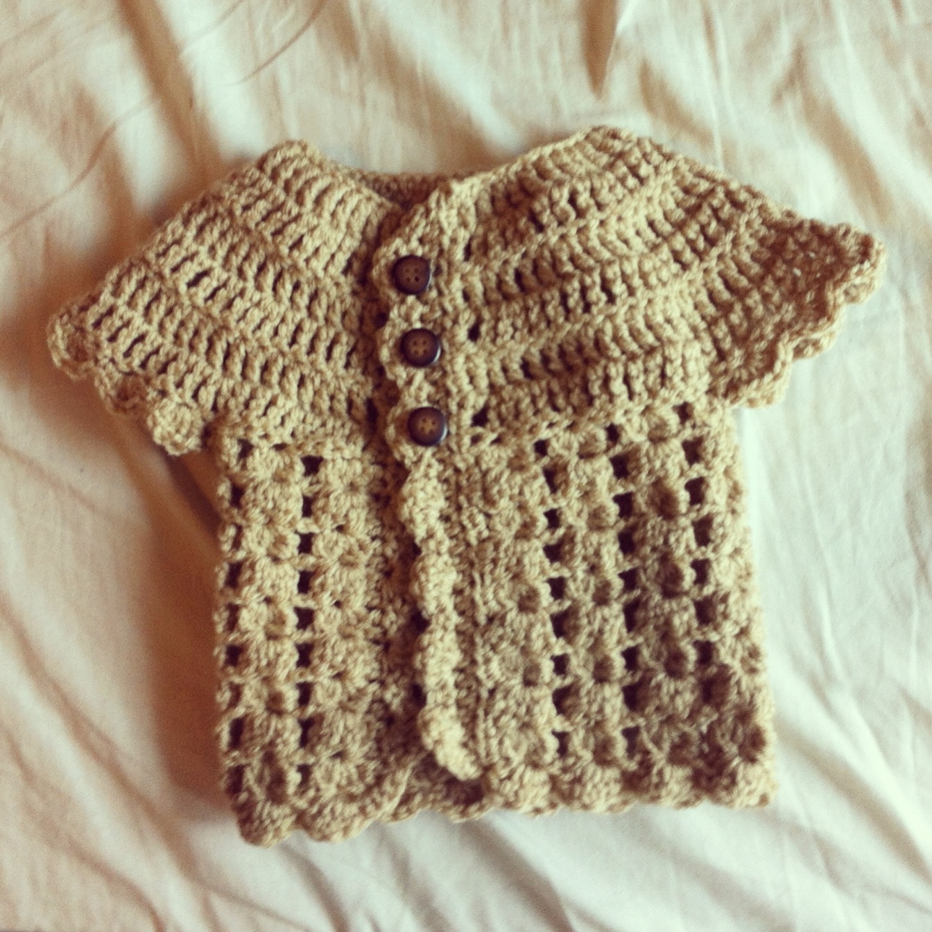 I used this free pattern but made some tweaks. For instance, I put the arm holes in off-center so that it would be asymmetrical. I like that. I also kept the sleeves short and added a scallop around all the edges.