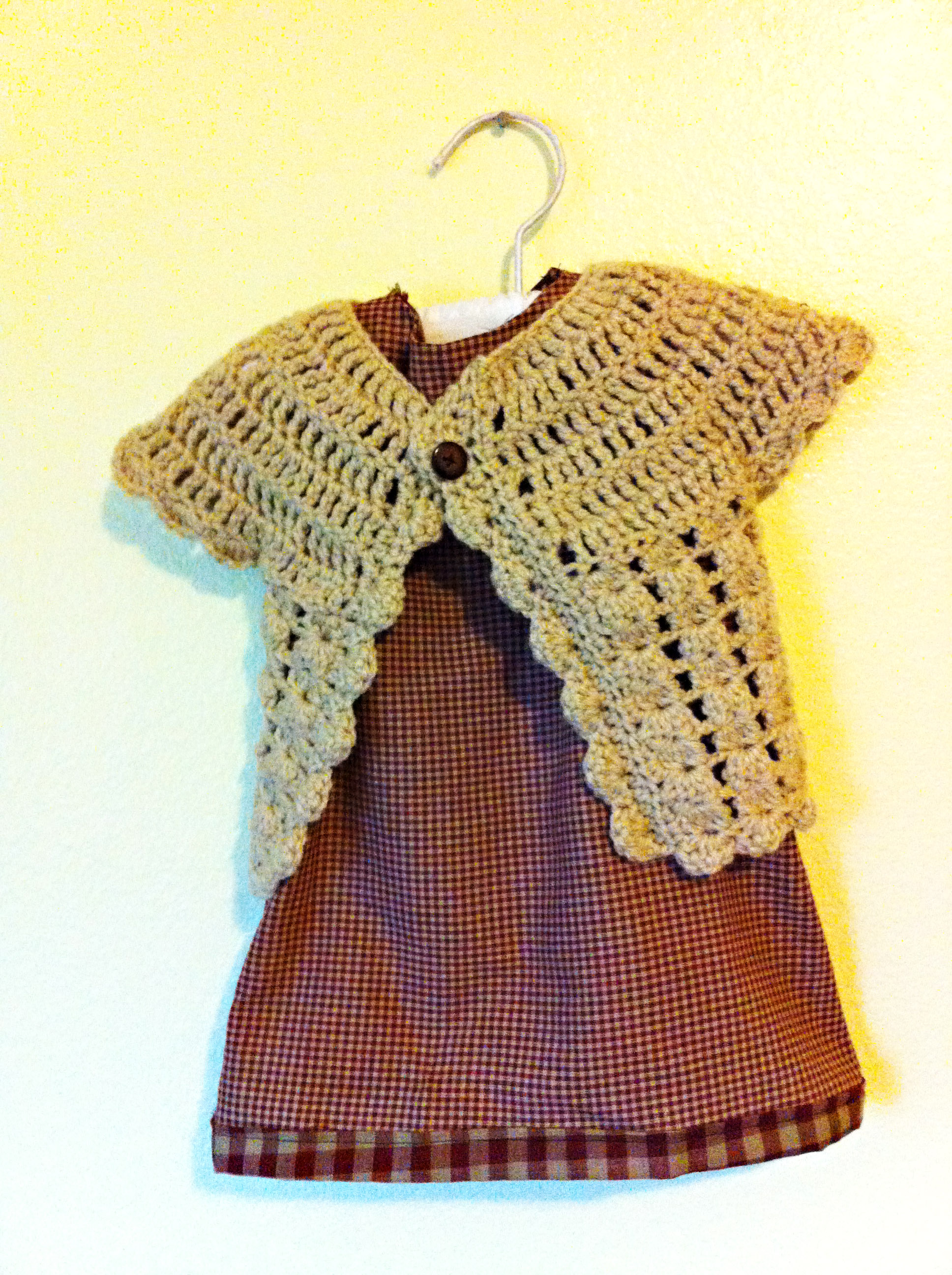 As you can see, I took out the bottom two buttons. I thought the sweater hung better with just the one. If it were over a onesie, I think it would look okay with the three buttons. The shape of the dress, though, made it kind of weird looking.