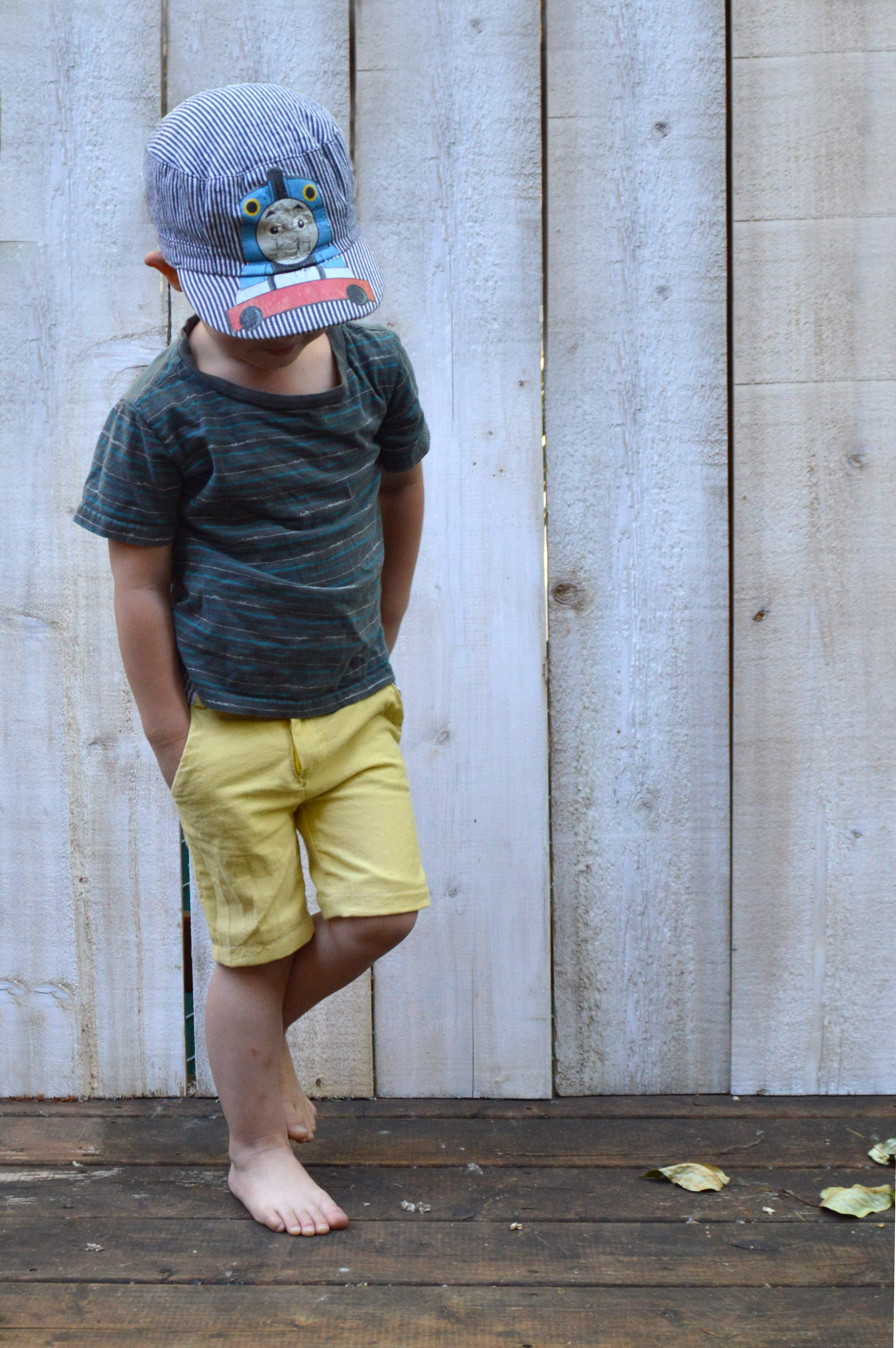 Since making these, the waistband has been modified slightly and there have been some optional fly additions (faux fly with elastic waist) to the pattern. I decided that we’d probably get more use out of these if they were shorts, so I cut them off and added elastic to the back.