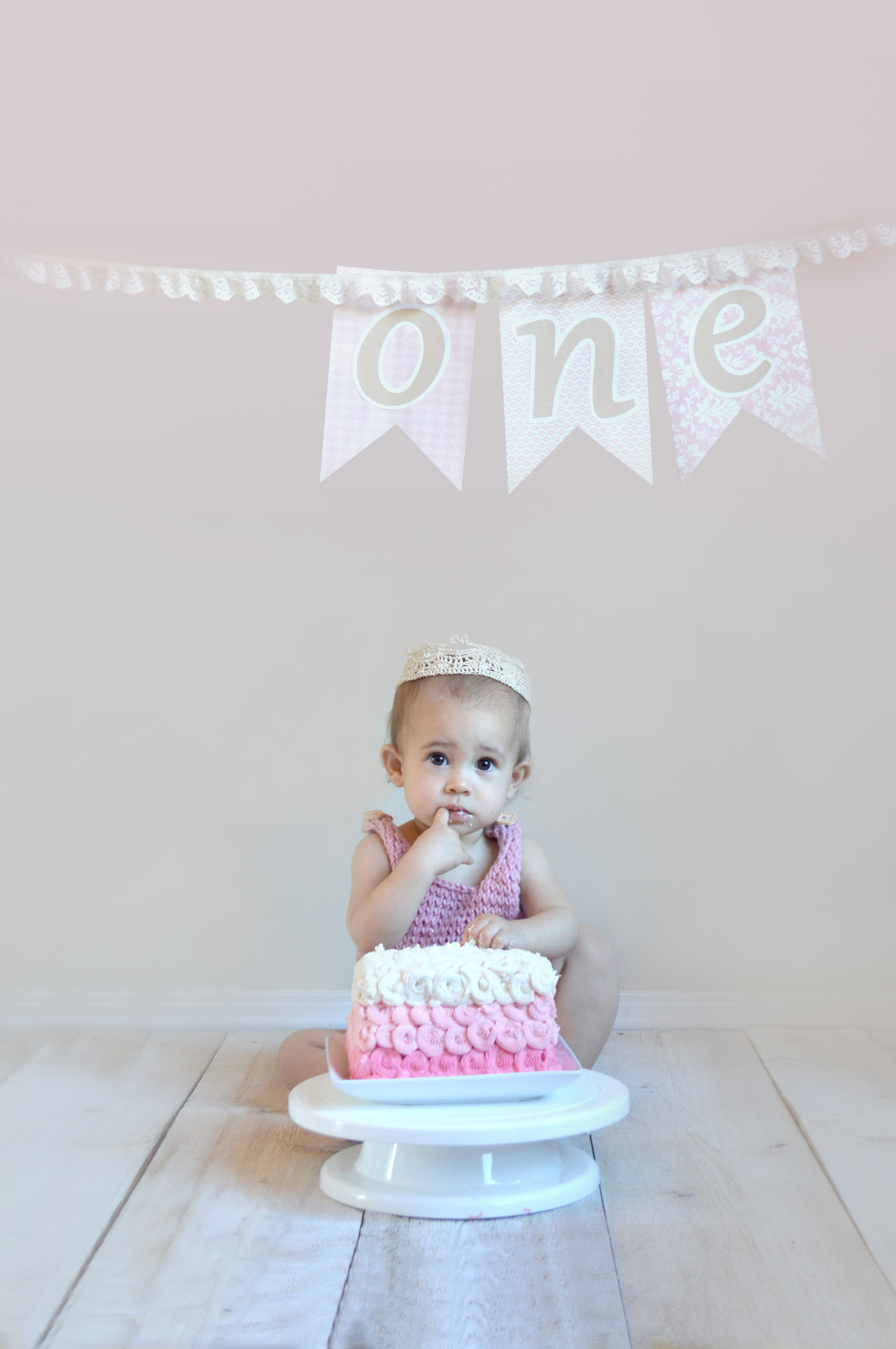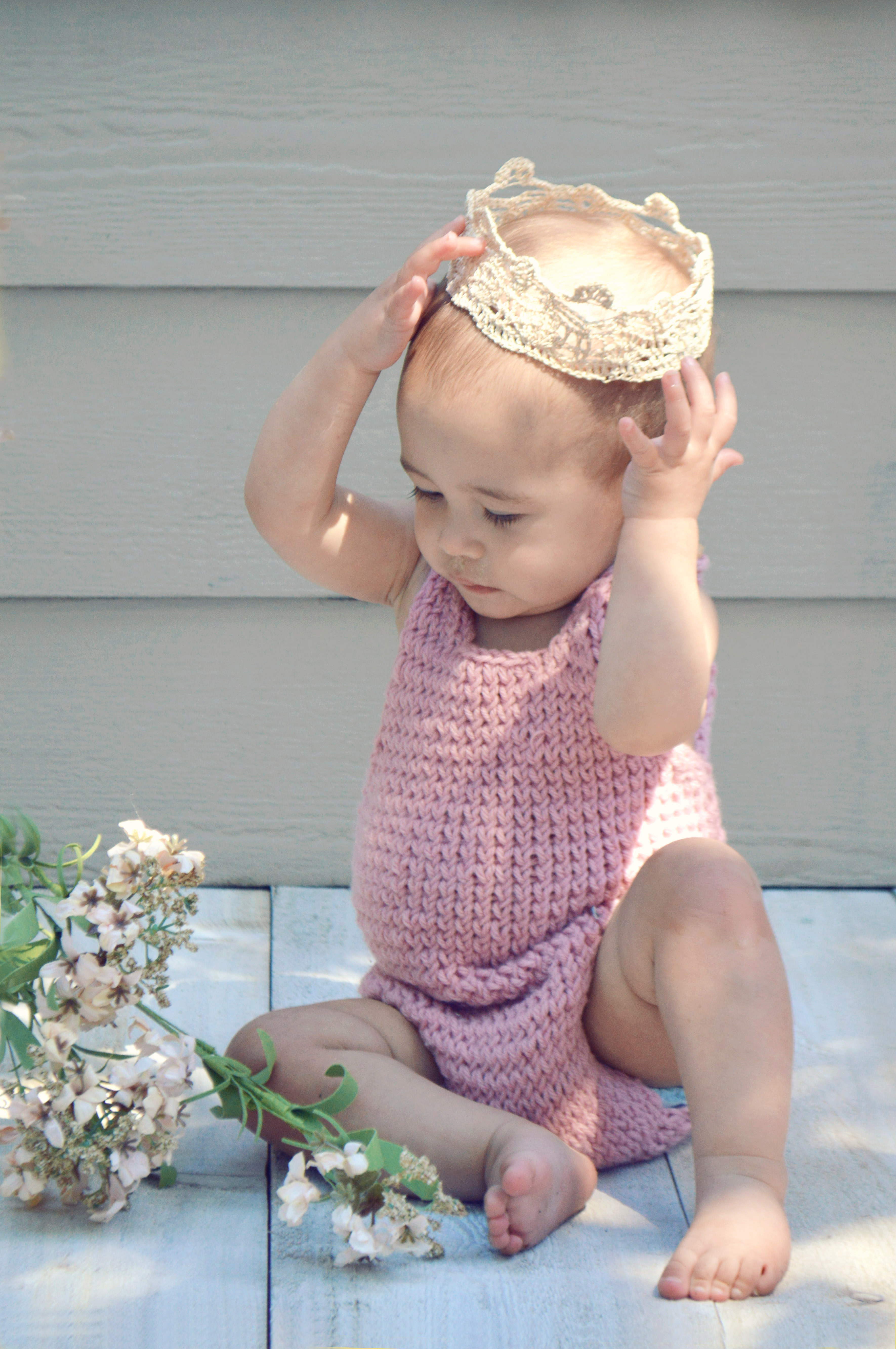 Well, then, my own little princess was turning one. I wanted to do her pictures very simply, with soft pinks and golds. I NEEDED a crown for her (even though she refused to keep it on longer than a second- unless there was cake in front of her face). It was super easy to simply add stitches to the starting chain to create a larger crown.