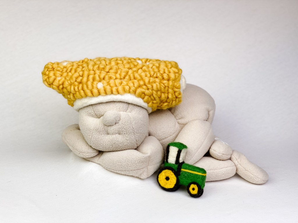 As for felting work, I have completed some fun and unique projects lately, like this crazy corn head hat and tractor stuffy. This is one of my more time consuming props– every kernel is stitched into place. I decided to count the individual kernels and have my social media followers guess. What’s your guess?
