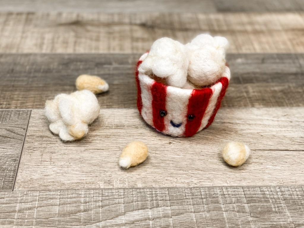 Today’s prompt is the January 19th “holiday” National Popcorn Day. Of course, I had to make a bucket of popcorn, but I wanted to exaggerate the size. I toyed around with the idea of putting faces on the actual popcorn pieces, but I decided that it would be cuter with just one face on the bucket.